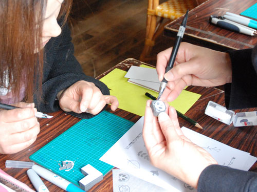 今回は初のコラボ企画!消しゴムハンコ作りと紙箱作り、せっかくだからハシゴして、オリジナルのペーパーアイテムを作ってしまおう!というもの。消しゴムハンコと紙箱、それぞれ別の会場で行うまさに「ハシゴ」のワークショップになりました。